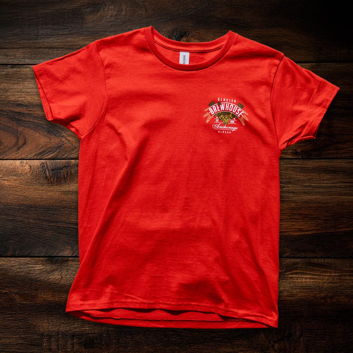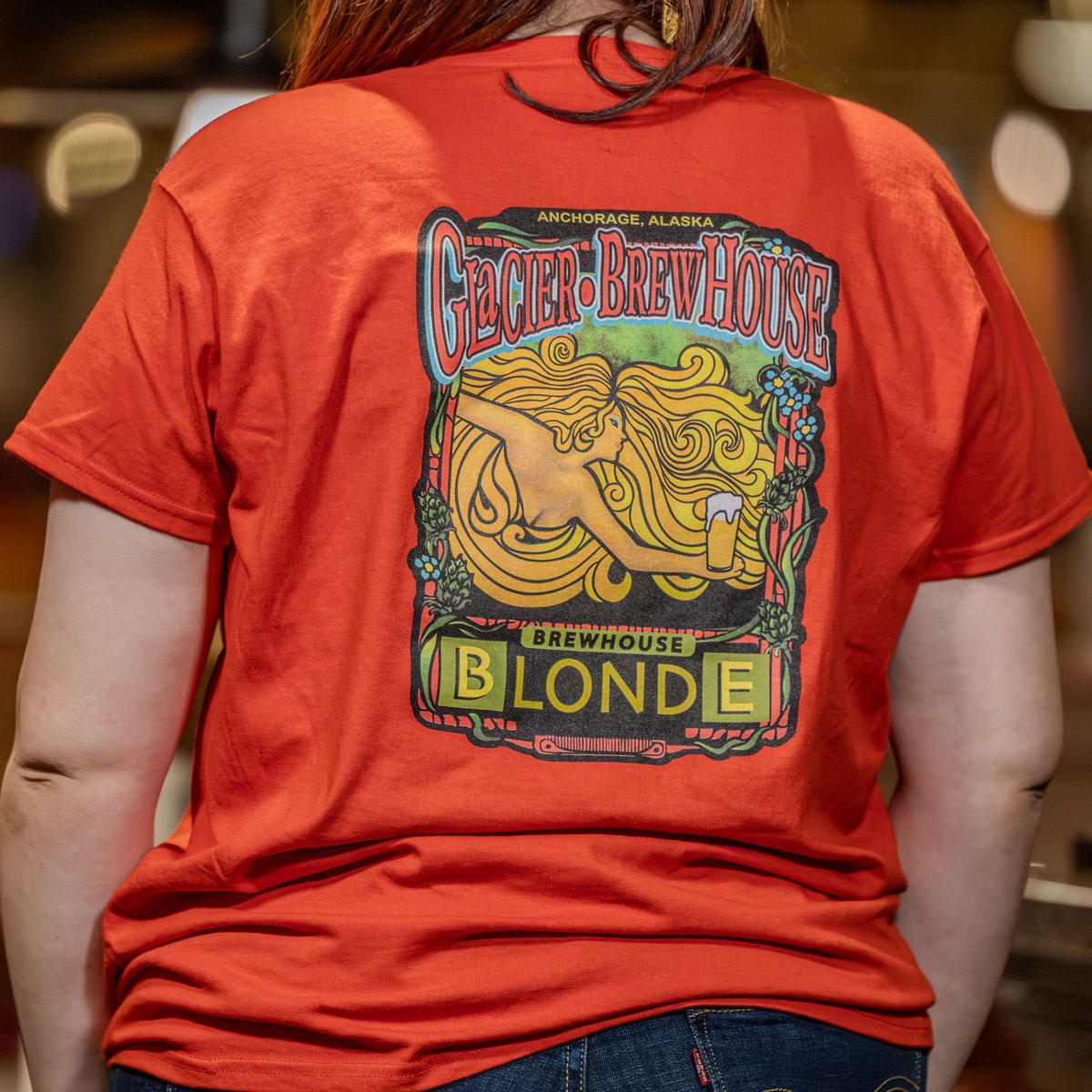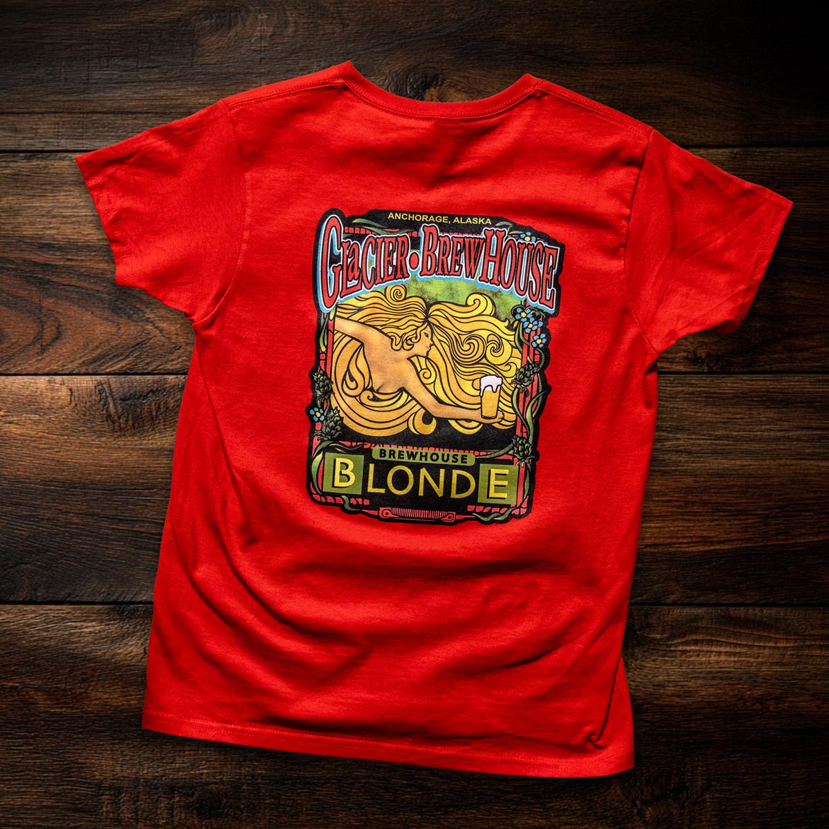 Celebrate one of Glacier BrewHouse’s most iconic beers with this Blonde Tee. Featuring vibrant, vintage-inspired artwork on the back and a subtle Glacier BrewHouse logo on the front, this shirt pays tribute to our flagship Blonde ale and the creativity behind it. Printed on a soft, breathable red cotton tee, it’s comfortable enough for everyday wear—whether you’re enjoying a pint at the BrewHouse, exploring Anchorage, or taking a piece of Alaska with you wherever you go. A standout design for longtime fans and first-time visitors alike.