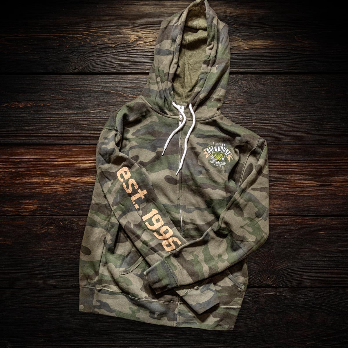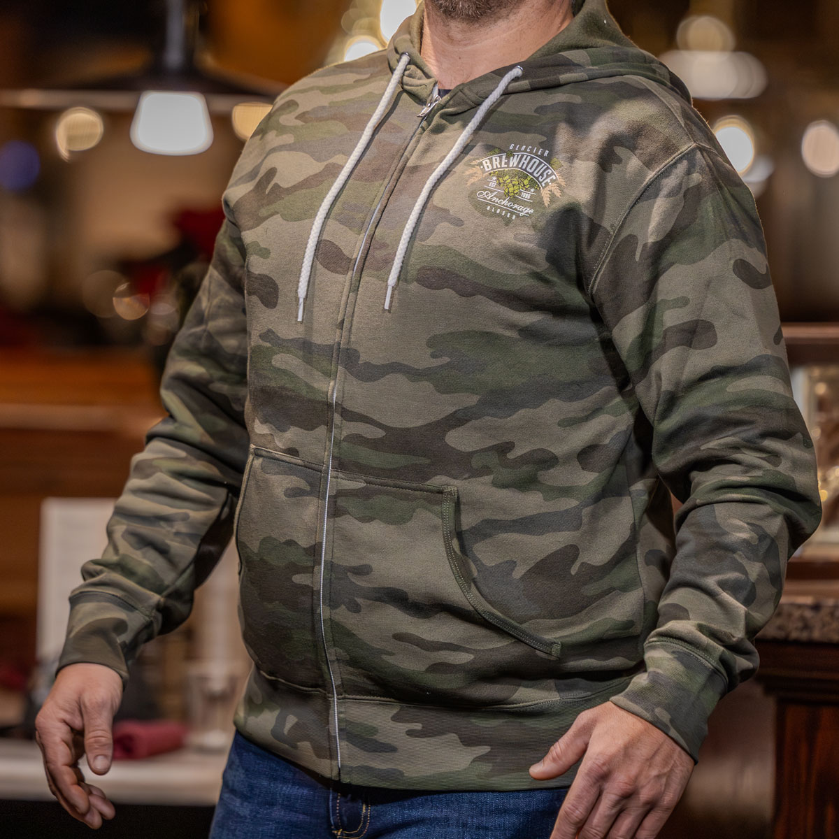 This Glacier BrewHouse camo zip-up hoody blends everyday comfort with unmistakable Alaska style. Featuring an all-over camouflage pattern, embroidered Glacier BrewHouse logo on the chest, and “Est. 1996” printed down the sleeve, this hoody is made for locals, visitors, and anyone who appreciates great beer and rugged design. The soft fleece interior keeps you warm without feeling bulky, while the full-zip front, adjustable drawstring hood, and front pockets make it easy to layer year-round. Whether you’re grabbing a pint at the BrewHouse, heading out on an Alaskan adventure, or relaxing fireside, this hoody delivers comfort and character in equal measure. A staple piece for Glacier BrewHouse fans who like their gear as bold as their beer.