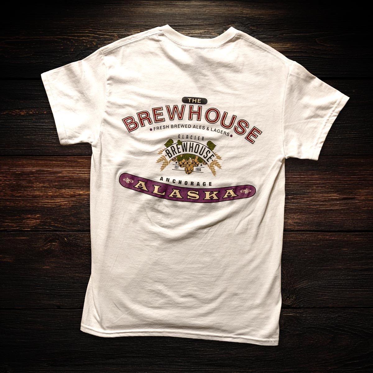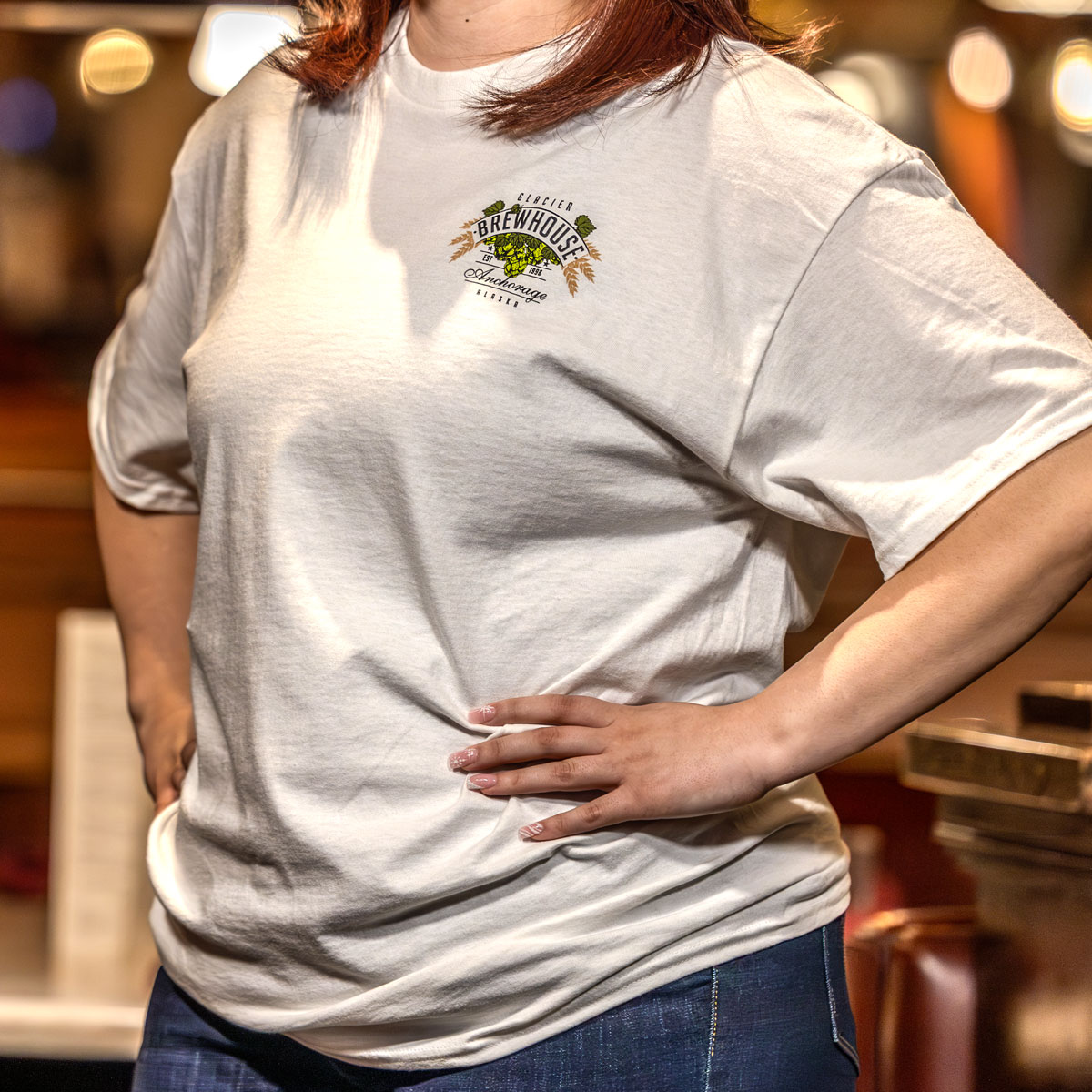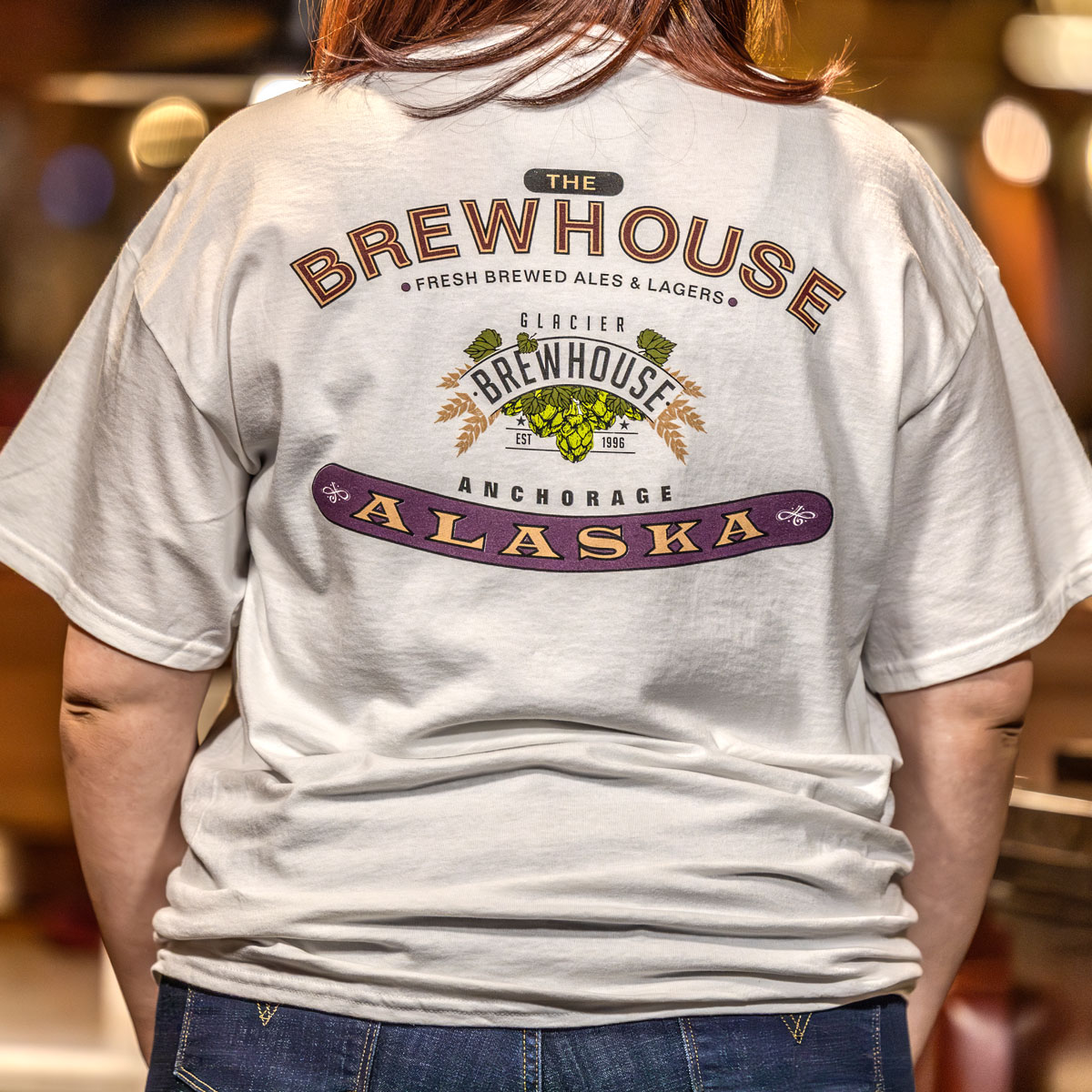 This Glacier BrewHouse classic white short sleeve tee is a nod to our long-standing brewing tradition in downtown Anchorage. Simple from the front and bold on the back, it features the Glacier BrewHouse logo over the heart and a full “The BrewHouse – Alaska” graphic across the back.