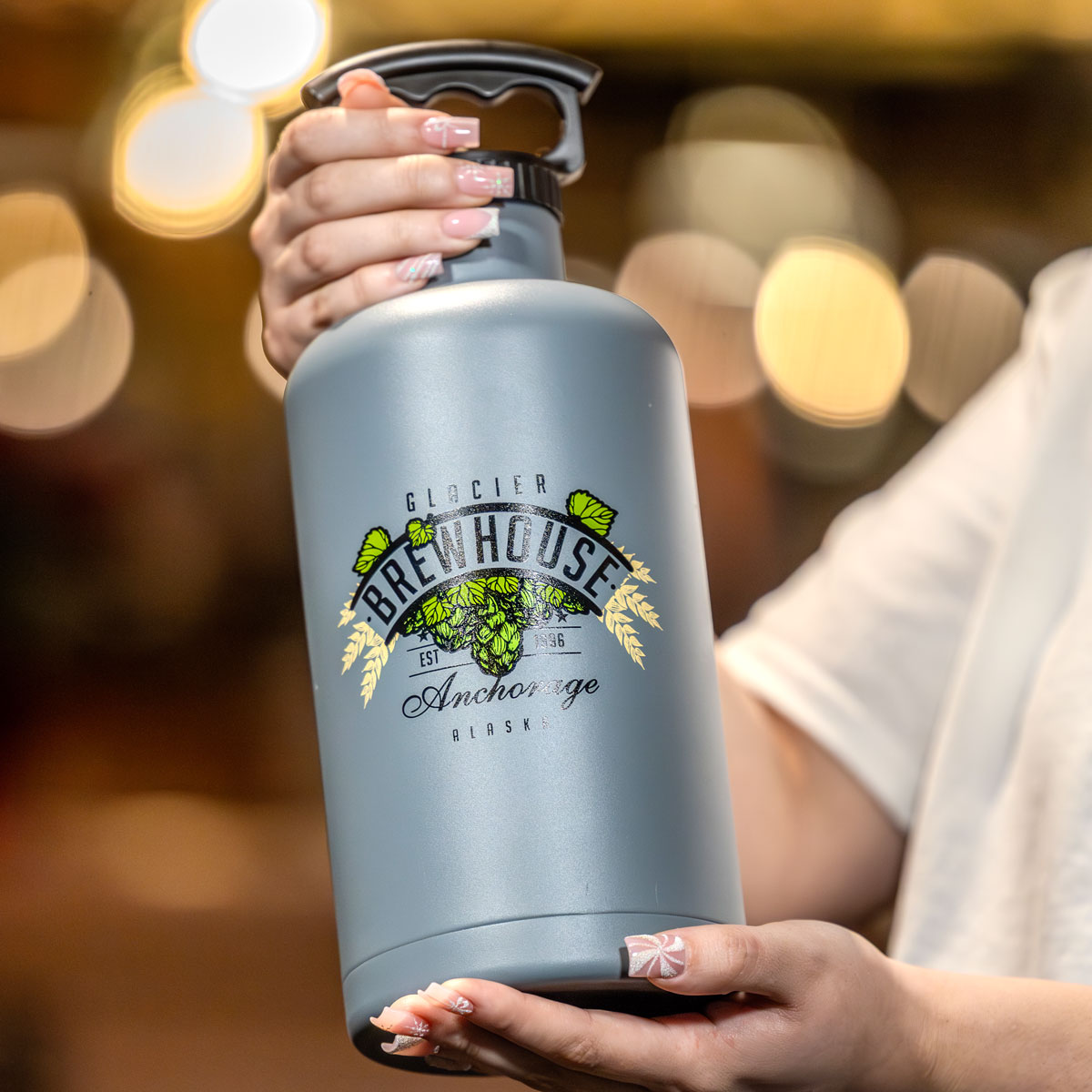 Bring Glacier BrewHouse quality wherever you go with this sleek, insulated logo growler. Designed for durability and everyday use, this growler features the iconic Glacier BrewHouse logo prominently displayed on a matte gray finish that looks just as good on the trail as it does at the table. Built to maintain temperature and reduce condensation, it’s perfect for carrying beverages on outdoor adventures, road trips, or simply around town. The sturdy handle lid makes transport easy, while the wide-mouth design allows for convenient filling and cleaning. Whether you’re a local, a visitor, or a longtime BrewHouse fan, this growler is a functional piece of Glacier BrewHouse gear you’ll reach for again and again.